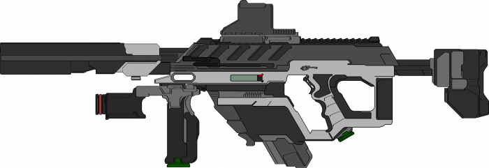The rifle features a flat top rail system to allow for the mounting for a wide variety of systems and optics however it lacks any kind of iron sights. Instead if a user has the right personal hardware suite or cybernetics it produces a standard augmented reality sight.